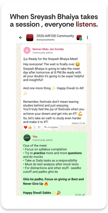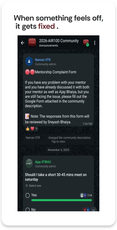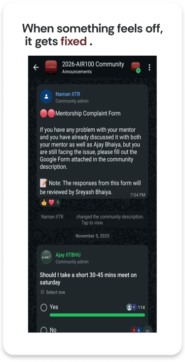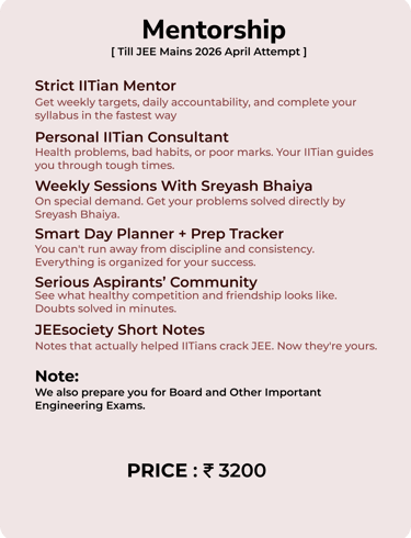 Over 70% of our students manage school and coaching. The IITian mentor teaches you to manage your existing load effortlessly and stay ahead, while also clearing backlogs.